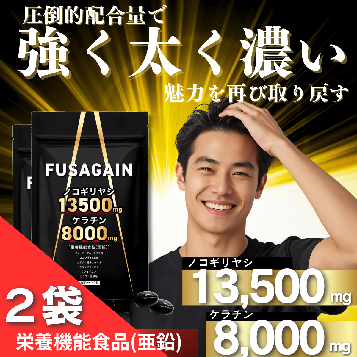 ノコギリヤシ サプリメント ケラチン 亜鉛 FUSAGAIN フサゲイン 頻尿 発毛促進 育毛 AGA 抜け毛 2袋セット