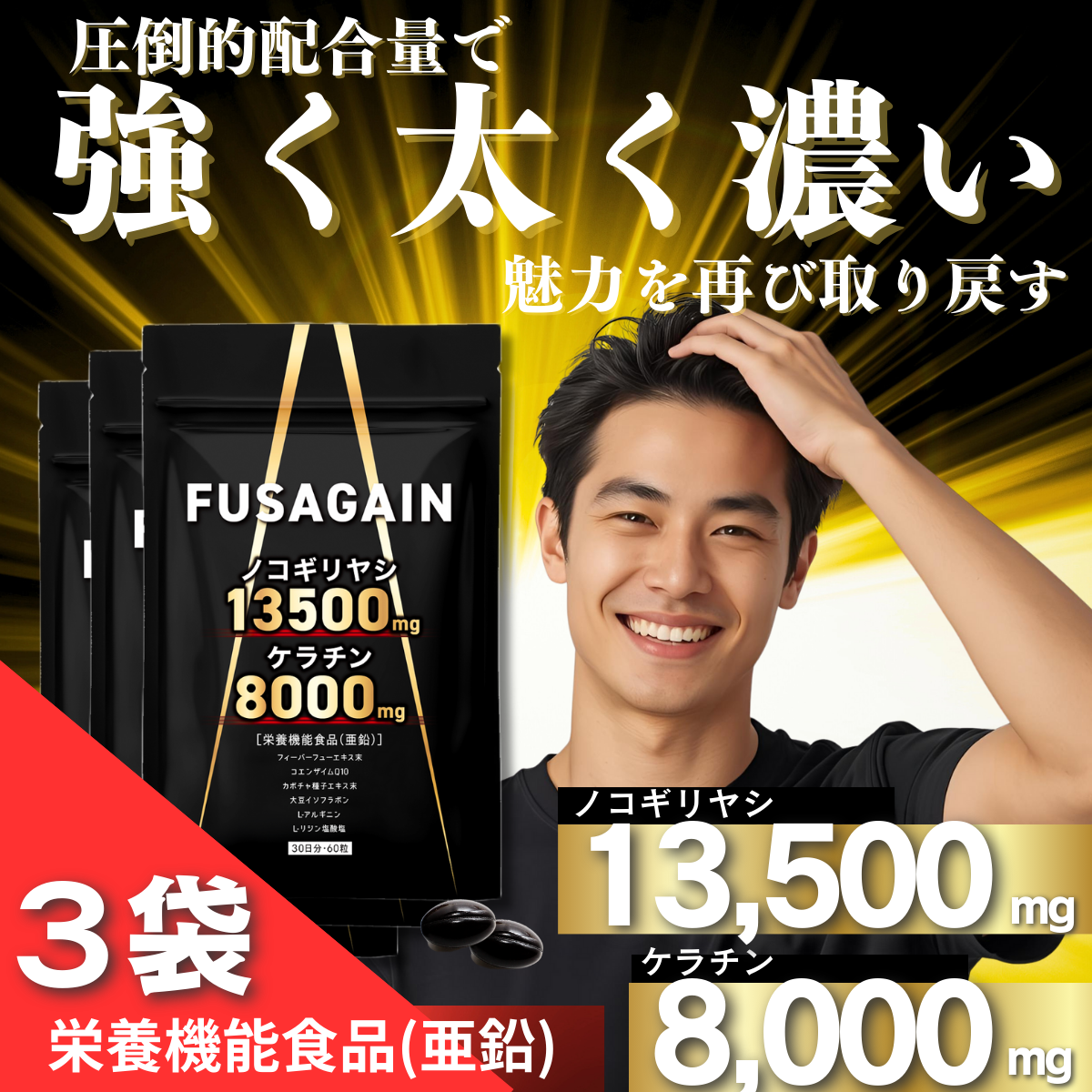ノコギリヤシ サプリメント 育毛 サプリ ケラチン 亜鉛 FUSAGAIN フサゲイン 発毛促進 男性 抜け毛 3袋セット