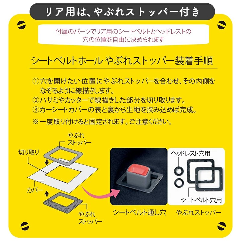 ●付属品(リア用のみ)/シートベルトホールやぶれストッパー2個、ヘッドレストホールやぶれストッパー8個