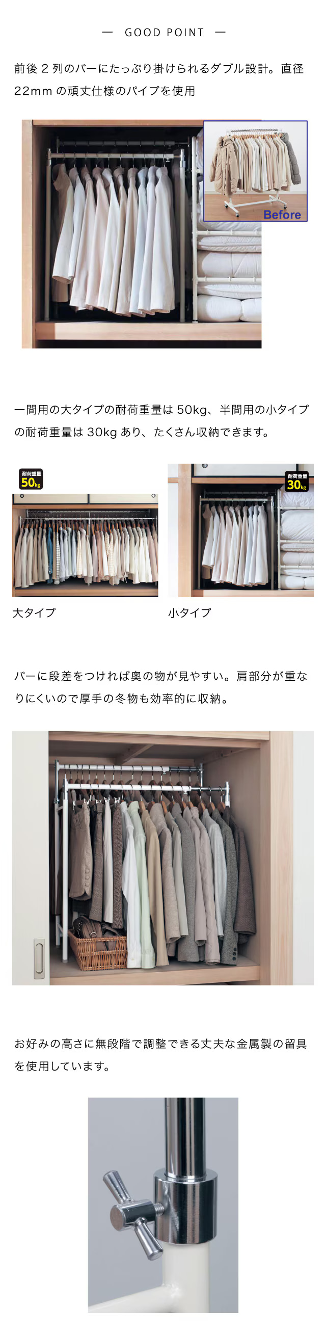 ●耐荷重量/ハンガーバー(1本あたり)小:30kg、大:50kg、ハンガーラック全体で小:30kg、大:50kg