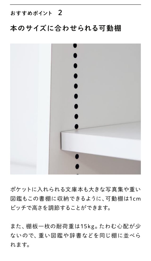 ●本の高さに合わせて調節できる1cmピッチの可動棚