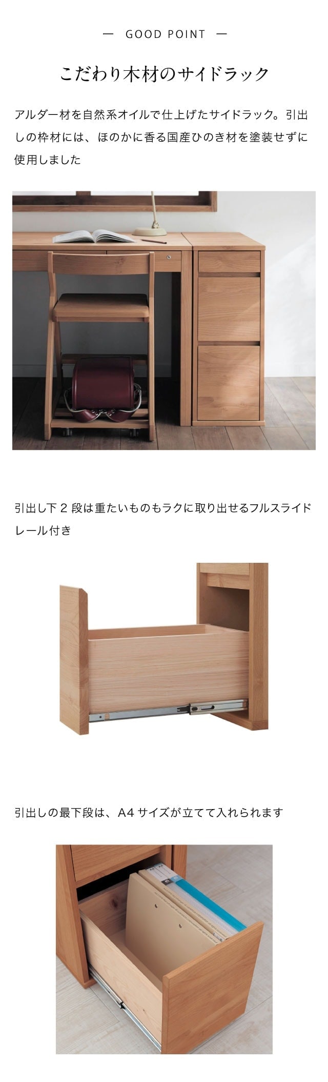●主材/天板・引出し前板:天然木(アルダー材<自然オイル仕上げ>)、引出し枠材:天然木(ひのき材)、その他:プリント紙化粧繊維板