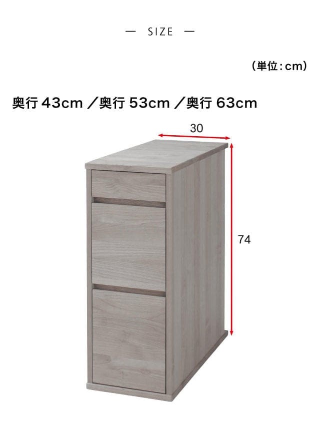 ●引出内寸/奥行43cm:22×31.5×6(高さ)cm・1杯、19.5×31.5×20.5(高さ)cm・1杯、19.5×31.5×25(高さ)cm・1杯奥行53cm・奥行63cm:22×36.5×6(高さ)cm・1杯、19.5×36.5×20.5(高さ)cm・1杯、19.5×36.5×25(高さ)cm・1杯
