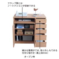 ●天板下のフラップ扉にはノートパソコン、コード穴付きのプッシュ扉には本やファイル、ルーターが収まります