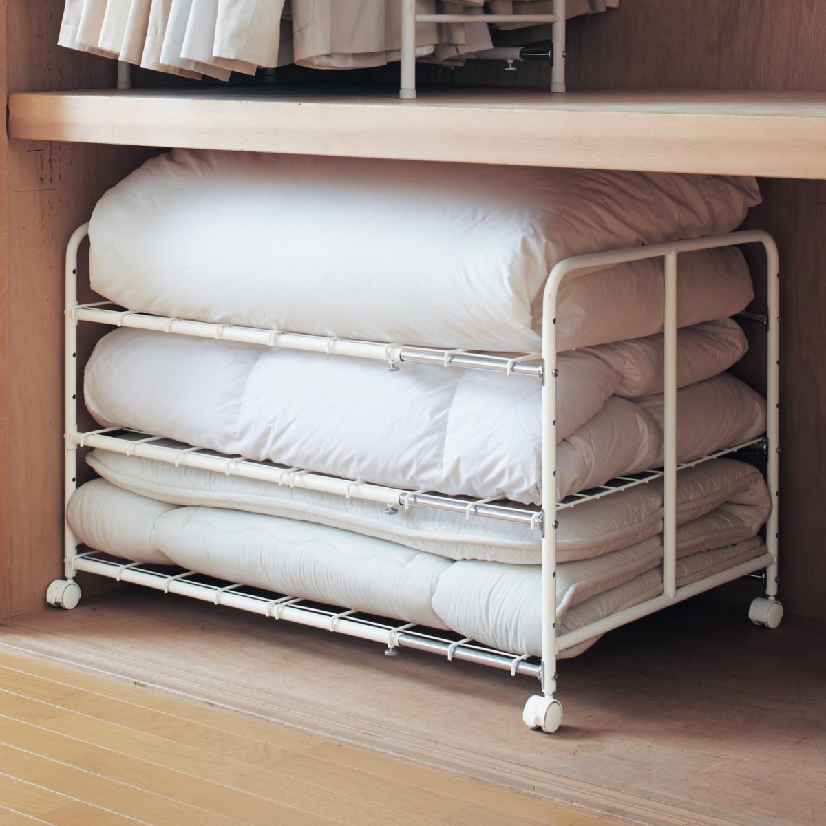 ●積み重ねてしまうと取り出しにくい布団を棚に仕分けて収納できるラック