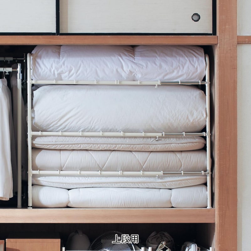 ●積み重ねてしまうと取り出しにくい布団を棚に仕分けて収納できるラック