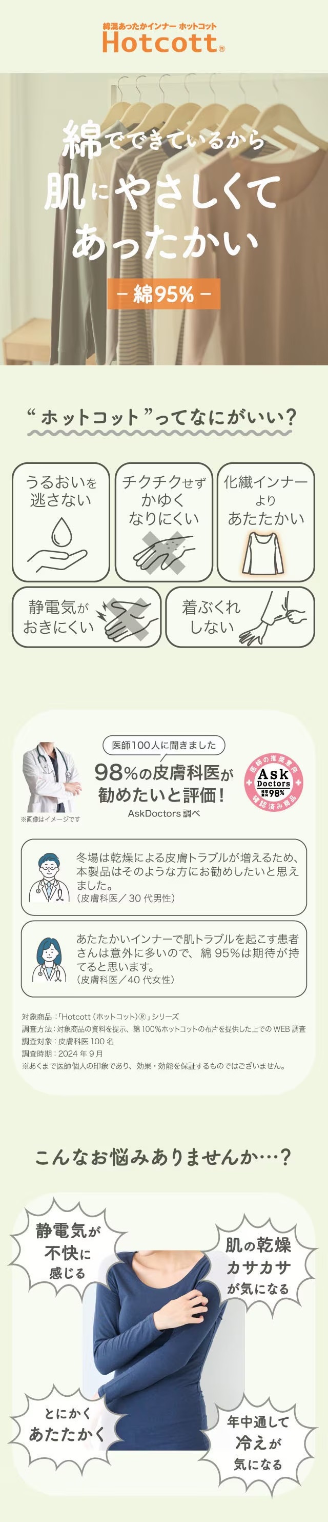 着た瞬間から暖かいのはもちろん、綿の優しい肌触りでかゆくなりにくく、乾燥から肌を守ってくれるなど、こだわりの詰まったアイテムを多数取り揃えています。