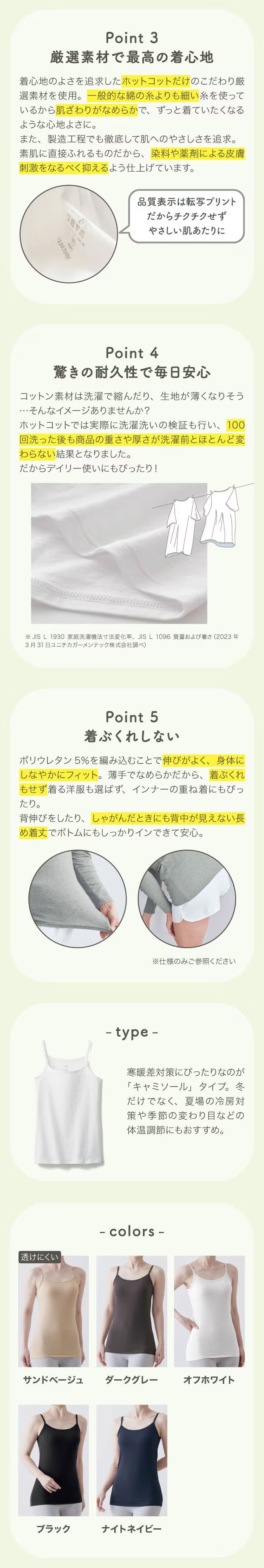 薄手であたたかく、重ね着にぴったり。ロングシーズン活躍するキャミソールタイプ