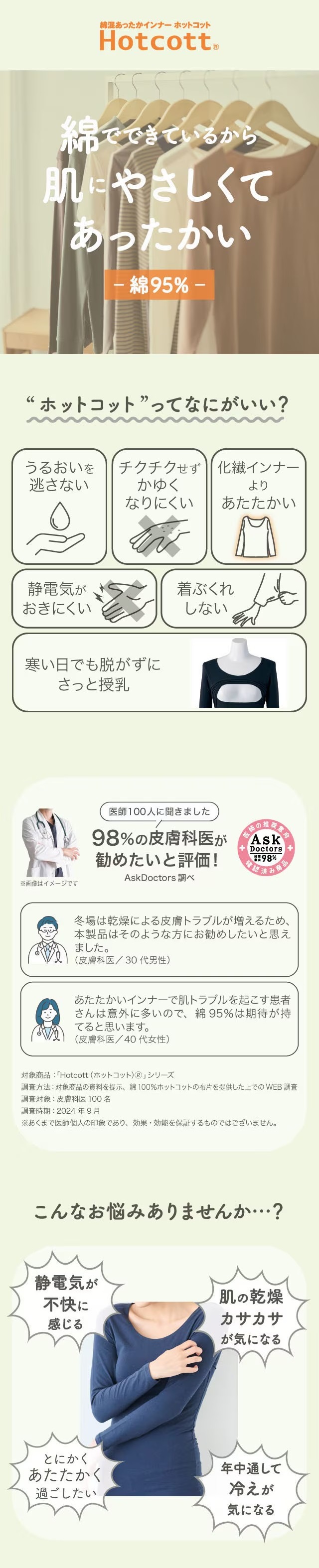 着た瞬間から暖かいのはもちろん、綿の優しい肌触りでかゆくなりにくく、乾燥から肌を守ってくれるなど、こだわりの詰まったアイテムを多数取り揃えています。