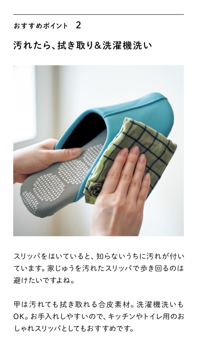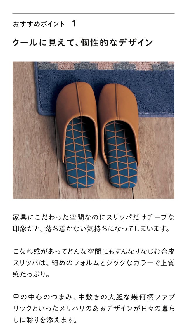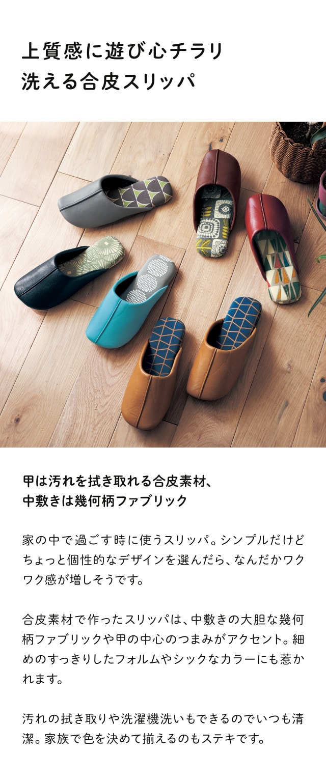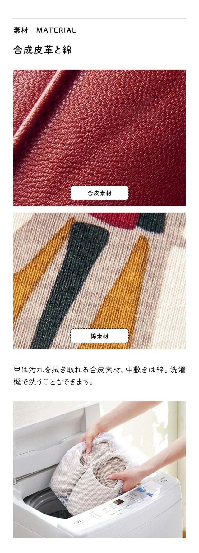 ●甲が合皮でさっと拭いてお手入れでき、トイレ用のスリッパとしてもおしゃれ