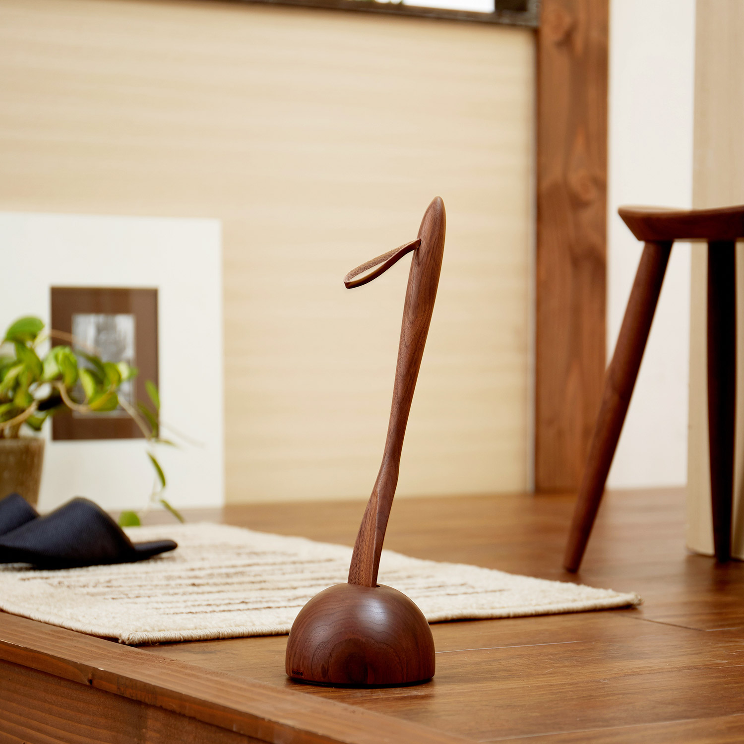 ●きれいな木目とシックな色合いを持つウォルナットの無垢材で仕立てた、靴べらと専用スタンドのセット