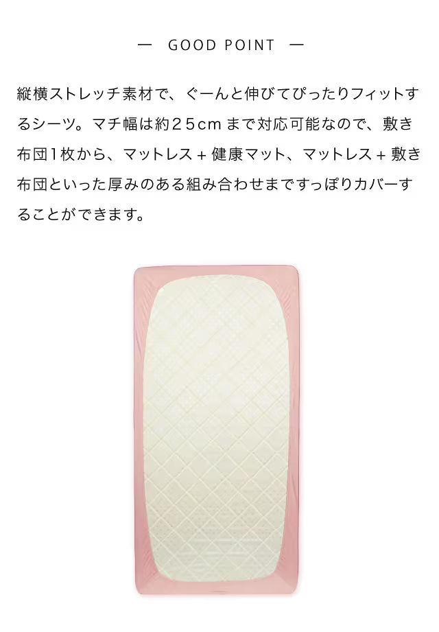 ●マチ幅は約25cmまで対応可能なので、敷き布団1枚から、マットレス+健康マット、マットレス+敷き布団といった厚みのある組み合わせまですっぽりカバーすることができます
