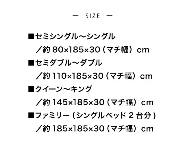 ■セミダブル〜ダブル/約110×185×30(マチ幅)cm