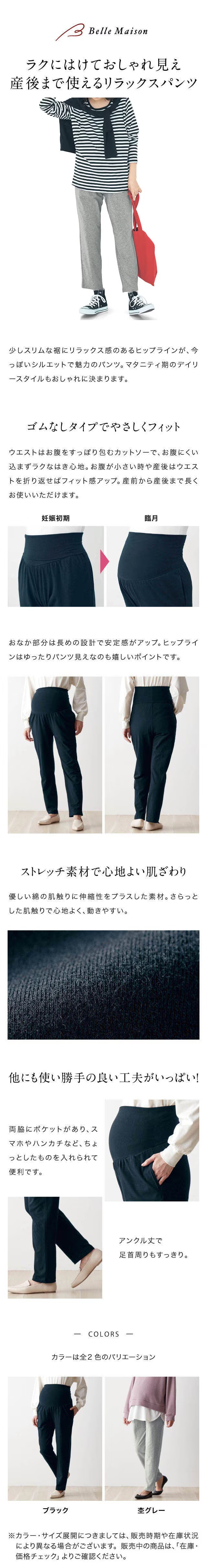 ―デザイン・スタイリング―・リラックス感があり、今っぽいシルエットが魅力・マタニティ期のデイリースタイルもおしゃれに演出・おなか部分は長めの設計で安定感がアップ―素材―・肌触りが良く、程よく厚みのあるベア天竺素材―機能―・ウエスト部分はゴム無しで快適にフィット