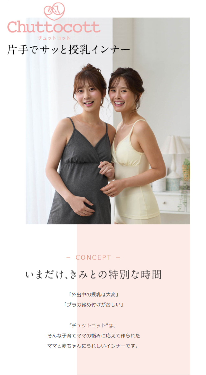 ◆chuttocott(チュットコット)チュットコットは、子育てママの悩みに応えて作られたママと赤ちゃんに嬉しいオリジナルの授乳インナー。