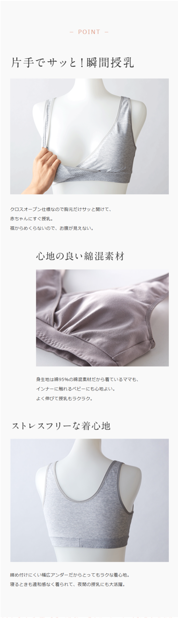 サッと授乳しやすいクロスオープン仕様や、綿混素材の優しい着心地など、こだわりをギュッと詰め込みました。