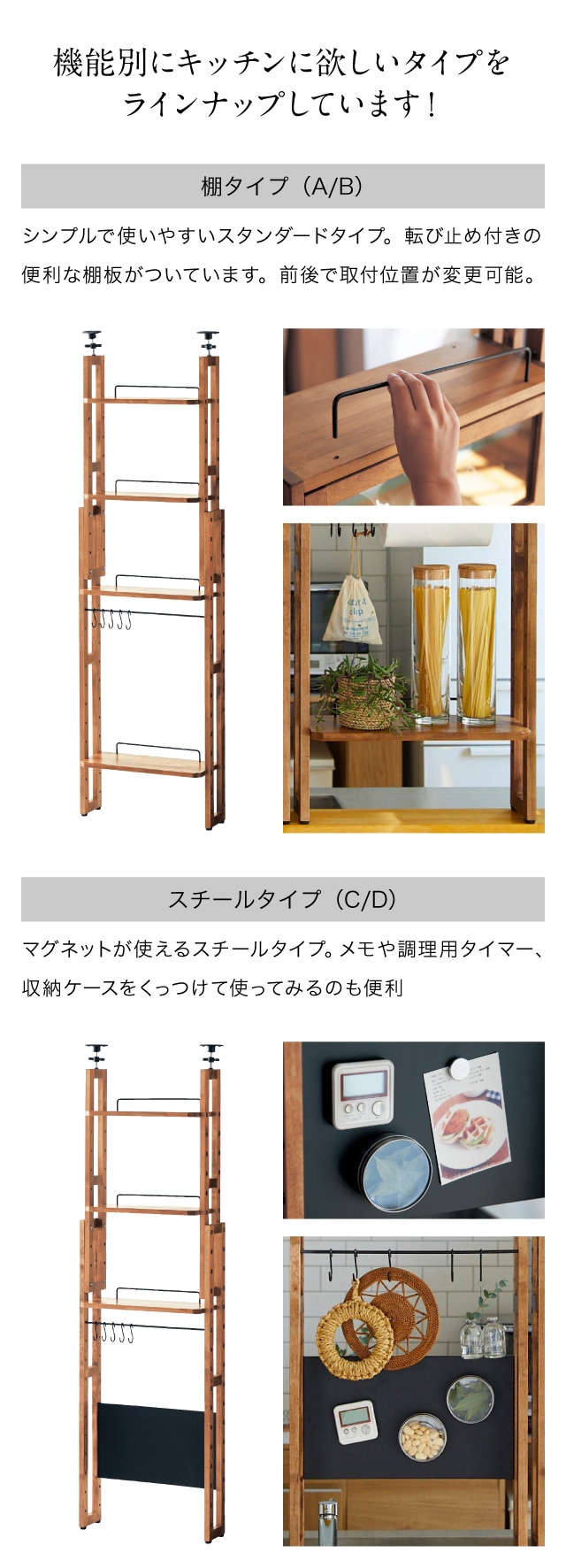 本体:天然木(カバ材<ウレタン樹脂塗装>)、スチールボード(C・Dのみ)・フック・バー:スチール(エポキシ樹脂粉体塗装)、その他:3mm厚ガラス(E・Fのみ)