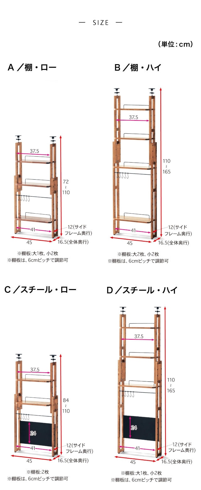 B/棚・ハイ 幅×奥行×高さ 45×16.5×110〜165cm、サイドフレーム奥行12cm