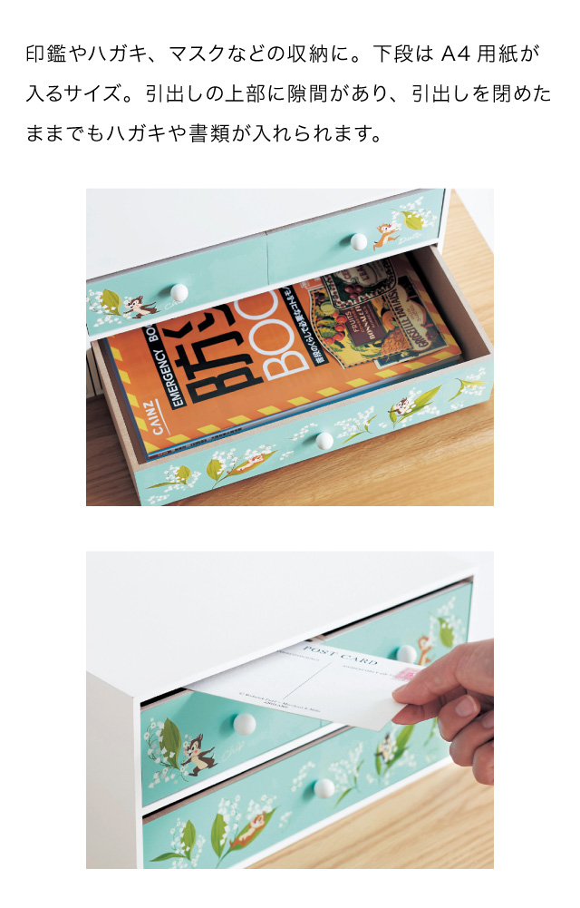 ●引出しの上部に隙間があり、引出しを閉めたままでもハガキや書類が入れられる