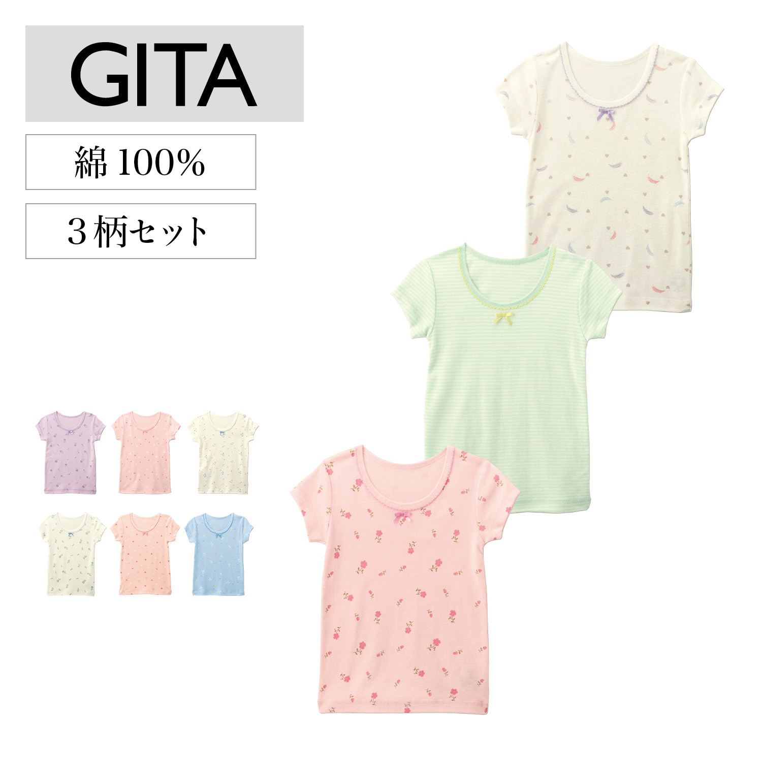 ―デザイン・スタイリング―・女の子の大好きな可愛いモチーフを集めた3柄セット・3柄が違っているから毎日いろんなデザインが選べて楽しい・襟ぐりリボン&ピコレースで前後がわかりやすい―素材―・肌触りの良い綿100%フライス素材―機能―・肌にあたらないよう洗濯ネームをプリントに・油性ペンで直接書けてにじみにくいお名前スペース付き