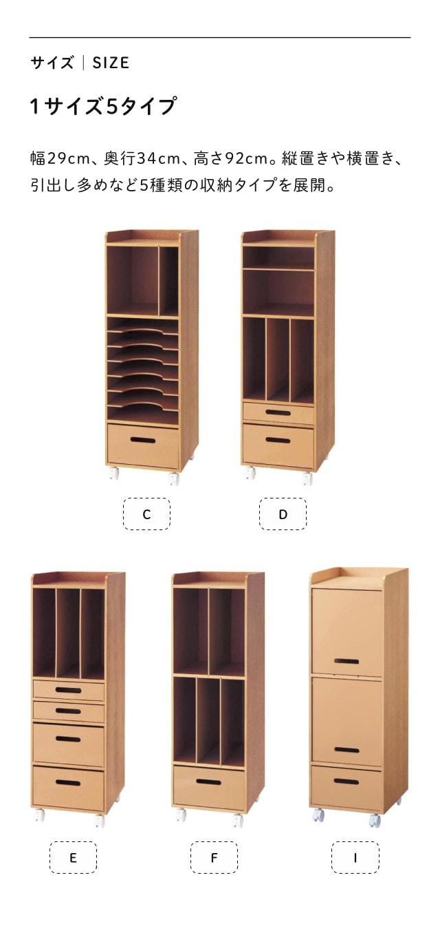 ●引出内寸/C・F・I:25.5×31×13(高さ)cm・1杯 D:25.5×31×5(高さ)cm・1杯、25.5×31×13(高さ)cm・1杯 E:25.5×31×5(高さ)cm・2杯、25.5×31×13(高さ)cm・2杯