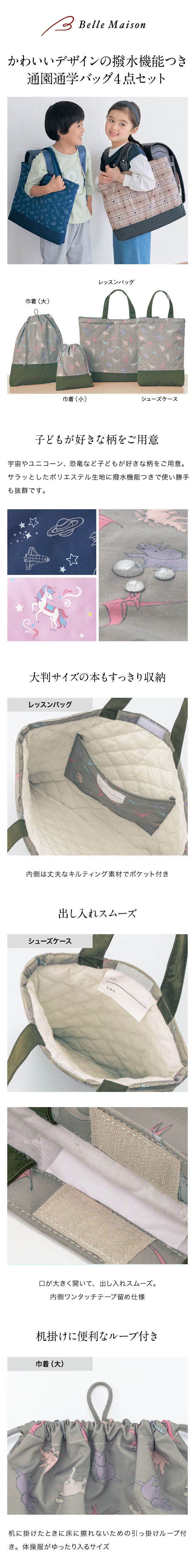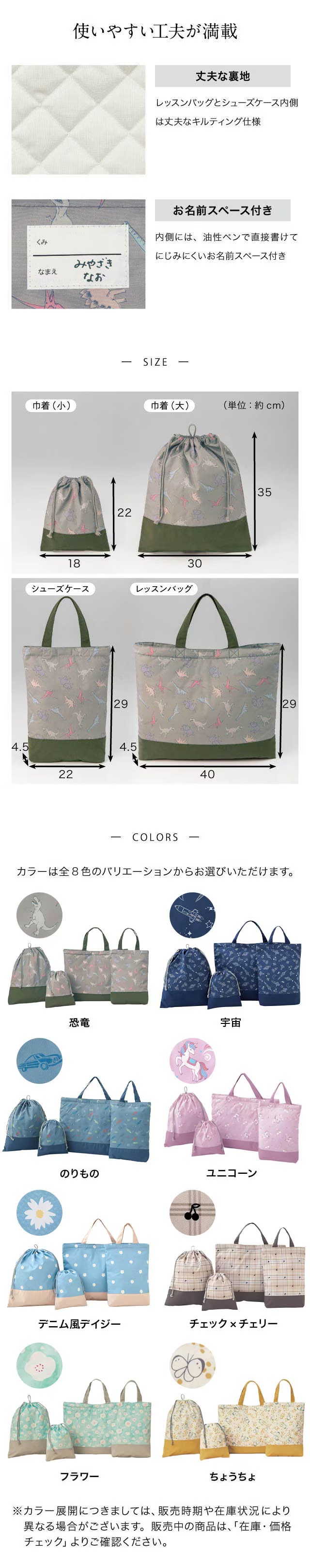 ●品質/側地:ポリエステル100%、(レッスンバッグ、シューズケースのみ)裏地:綿100%、中わた:ポリエステル100%