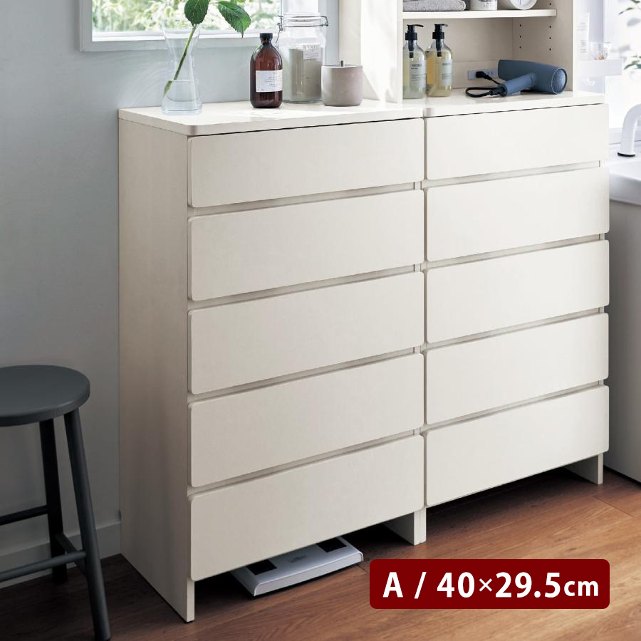 ●天板や引出しの前板は角が丸く、当たっても痛くなりにくいフォルムを施したサニタリーチェスト