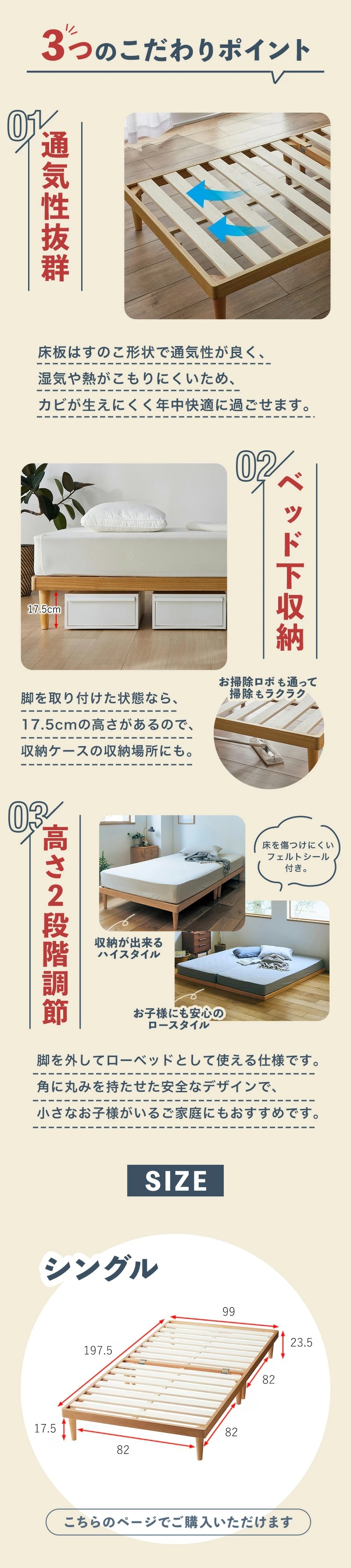 ●脚部使用時ベッド下高さは17.5cmあり、収納スペースとしても使えます
