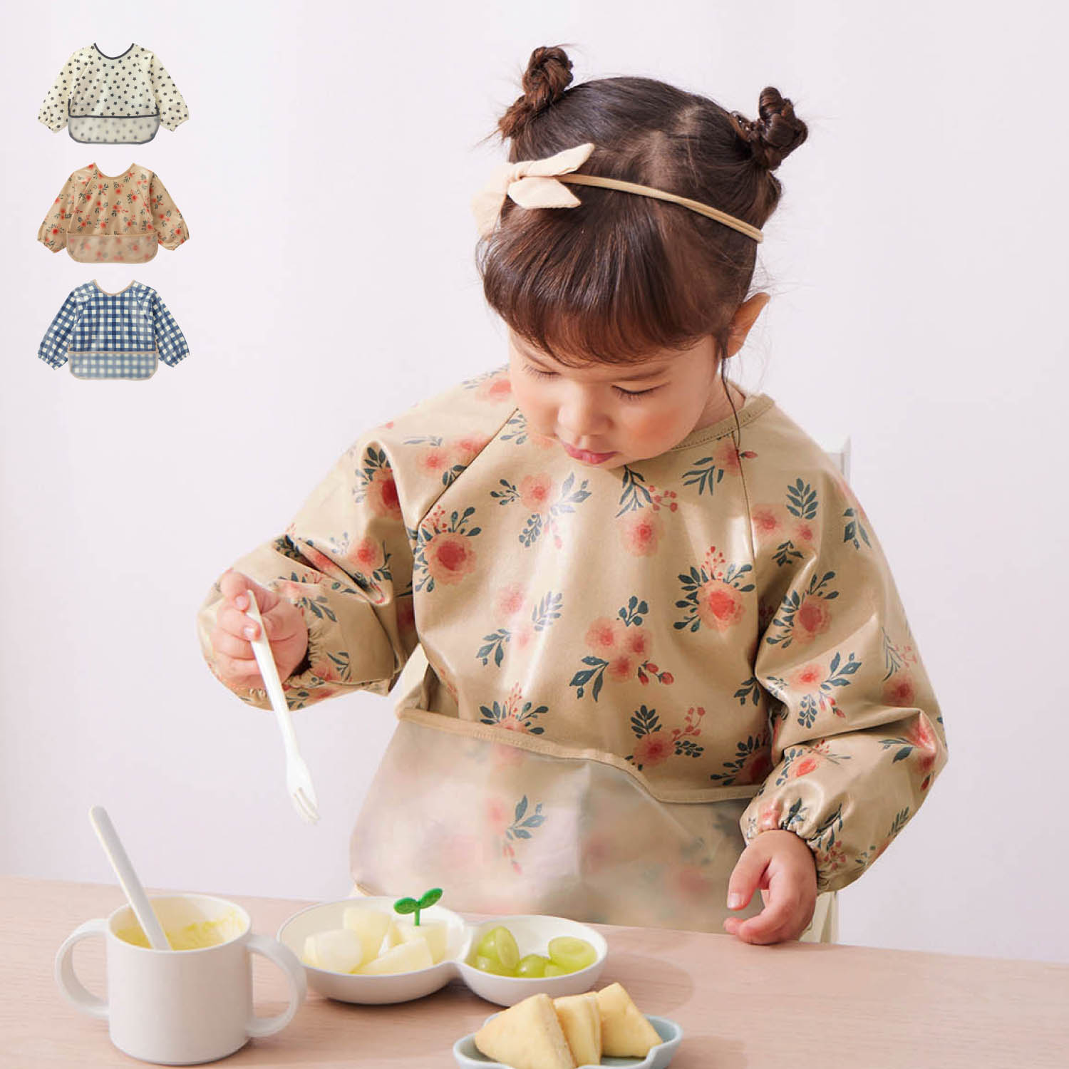 ―デザイン・仕様―・くるっと丸めて持ち運びもしやすく、園や外食にも便利・フロントのポケットが食べこぼしをキャッチ―素材―・本体部分は1枚仕立てなので従来品より軽く、湿気がこもりにくい―機能―・背中はスナップボタンで、着脱もらくちん