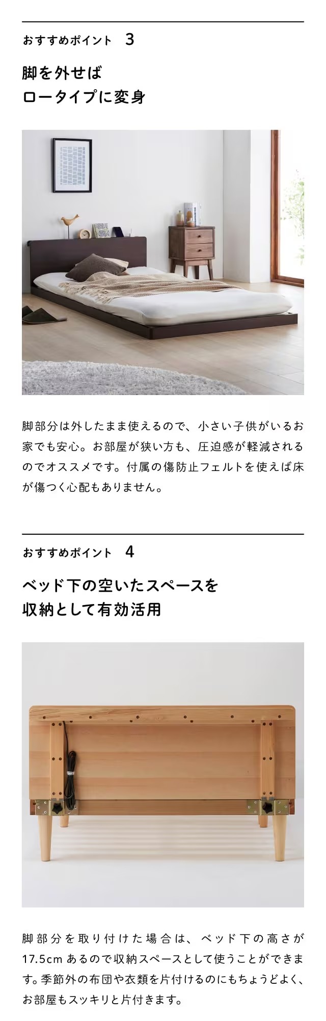 ●脚部使用時のベッド下は17.5cmあり、収納スペースとして使える