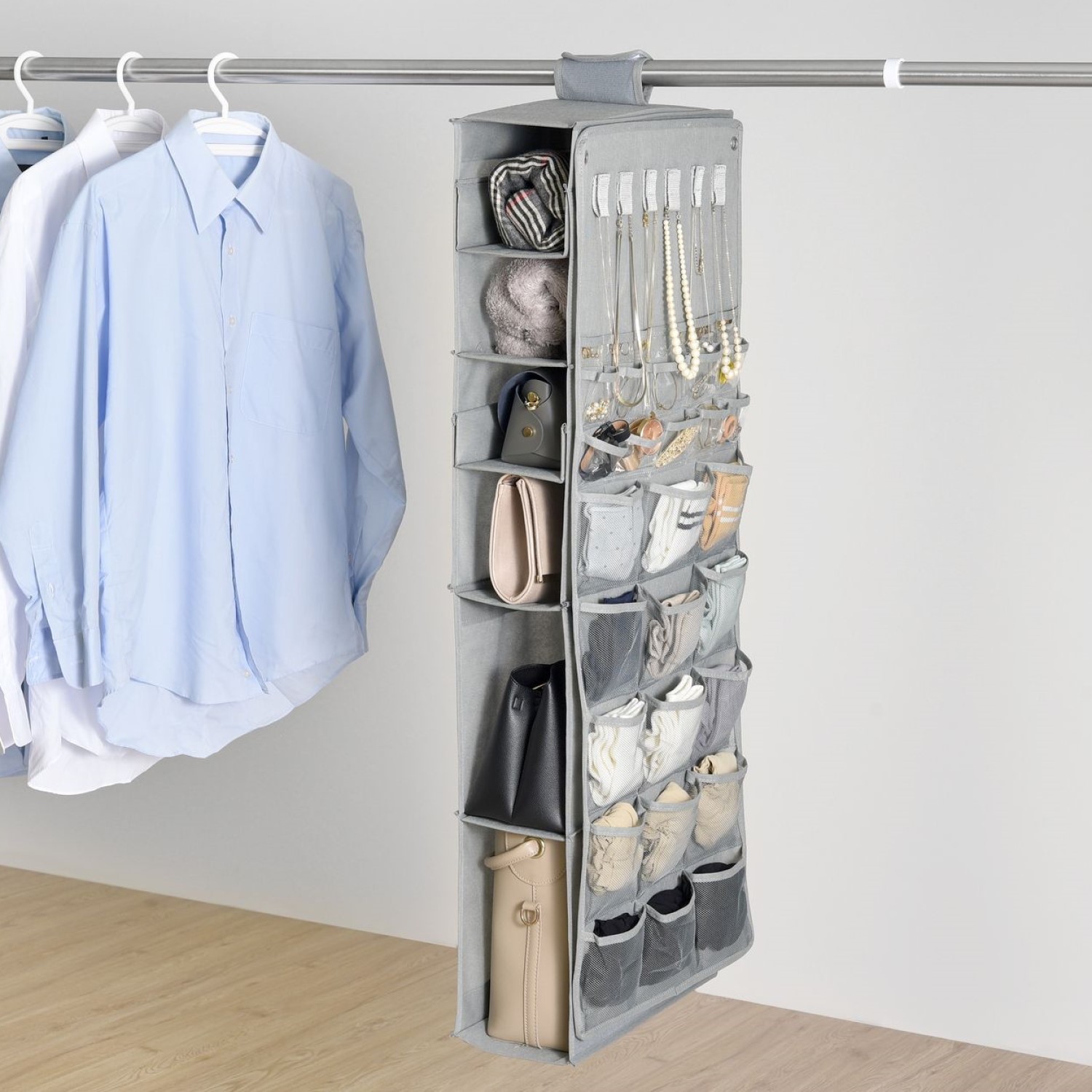 ●ネックレスなどを引っ掛けられるホルダーと、大・中・小合計31個のポケットが付いています