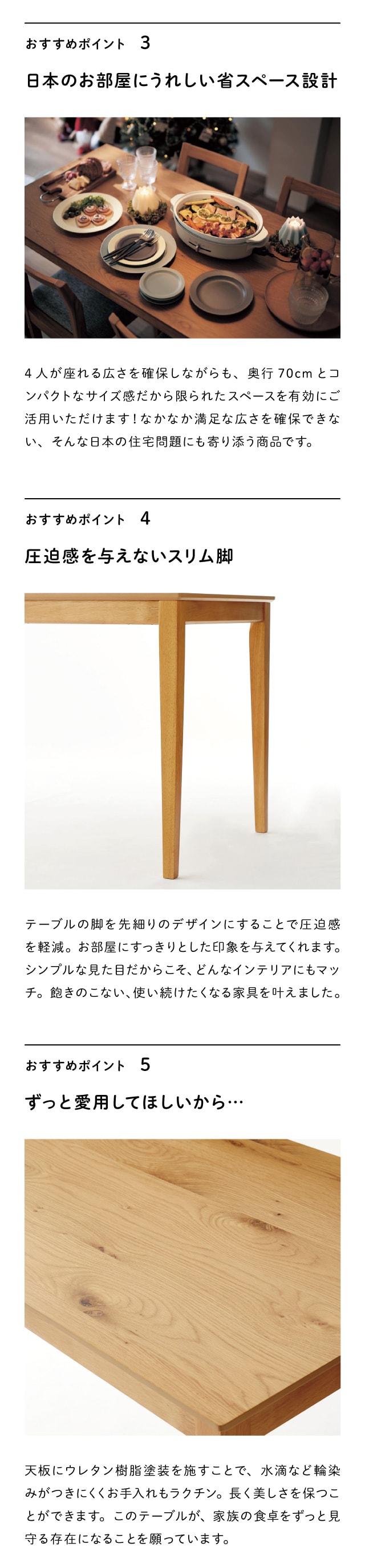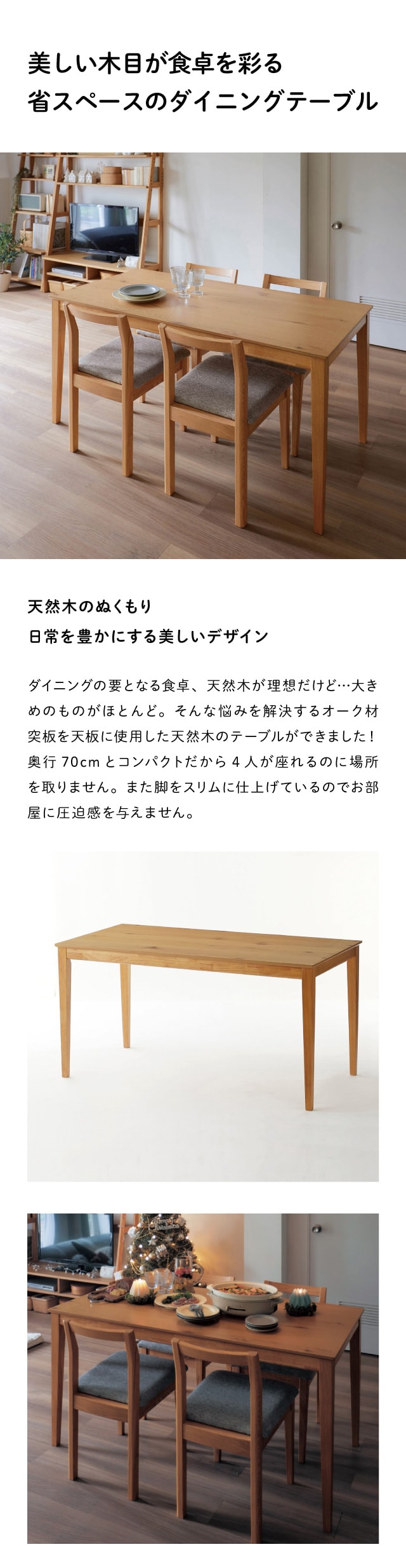 ●奥行が70cmと一般的なダイニングテーブルよりもスリムなサイズでコンパクトに置きやすい