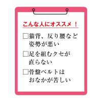 猫背、反り腰など姿勢が悪い方や、足を組むクセが直らない方、骨盤ベルトでは苦しい方にオススメ。