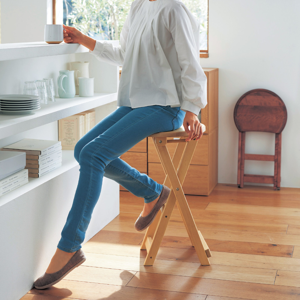 ーデザイン・スタイリングー・必要な時にサッと出して座れるスツール・円を少し削ったような半月型フォルムで座りやすく、デザイン性も◎・出しっぱなしでもおしゃれ・ハイタイプはキッチンで腰掛け使いに・ロータイプはダイニングやデスクに合わせてちょうどいい高さ・ソファー横のサイドテーブルにもぴったりー素材ー・天然木樺材を使用ー機能ー・使わない時は折りたたんで隙間に収納#木製スツール #折りたたみ #ハイスツール