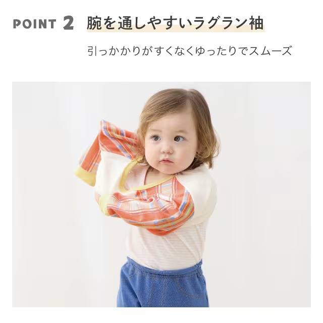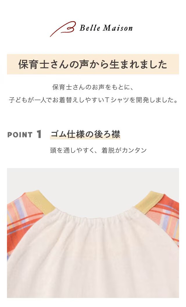 ・襟ぐりの後ろがゴム仕様で、一人で頭を通しやすい仕様