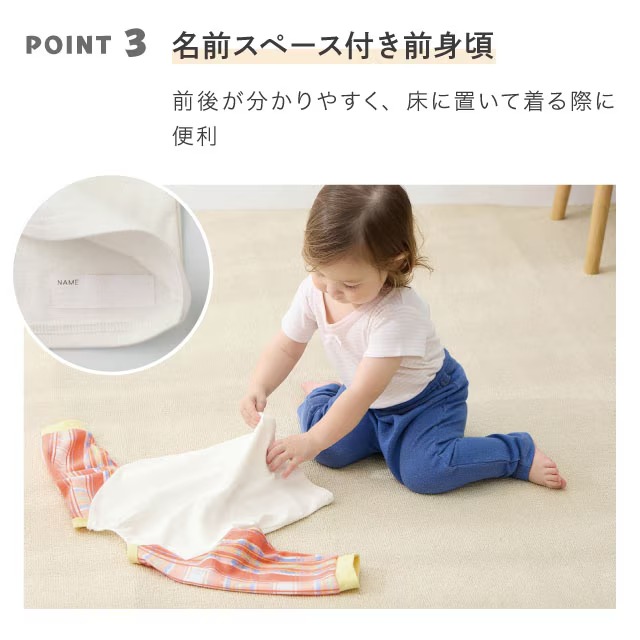 ・前身頃の右裾裏側にお名前スペースがあり、床に置いてから着ることが多い子どもたちにも前がわかりやすい