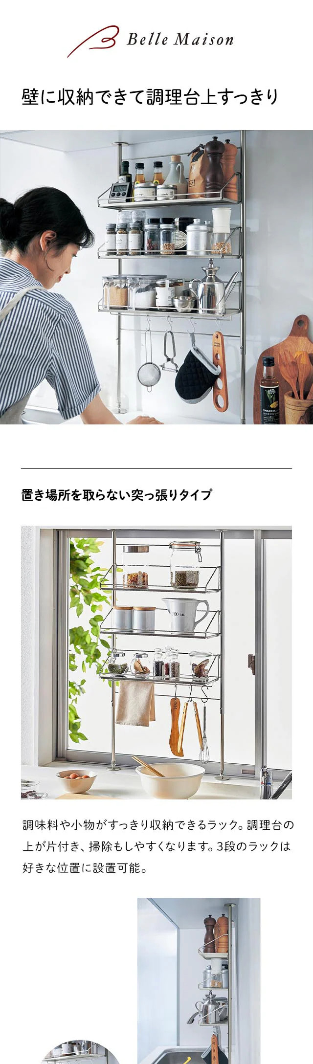 ・ラックは1段だけ吊り下げバー付きなので、布巾をかけたり、お手持ちのS字フックでキッチンツールを吊り下げることもできます
