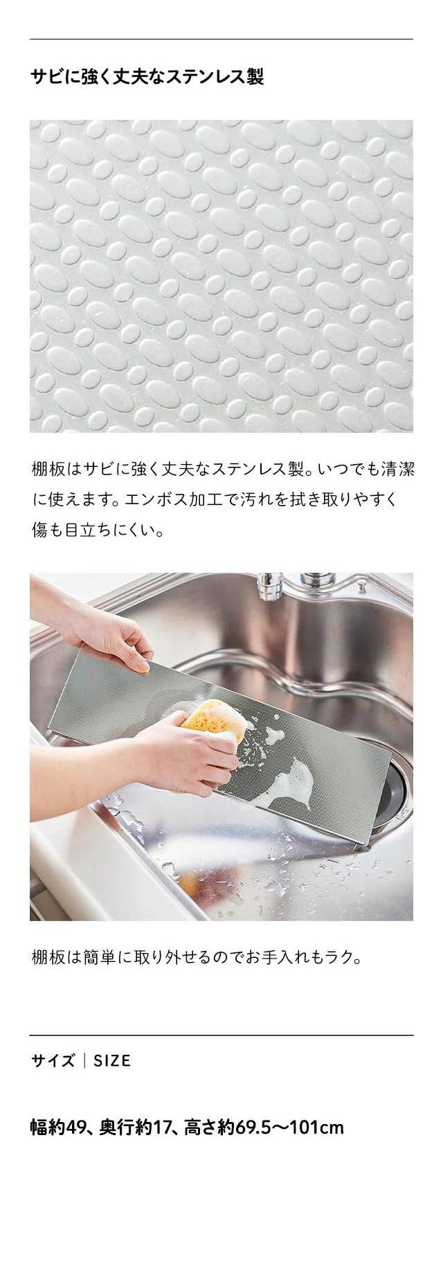 ・棚板はサビに強く丈夫なステンレス製。いつでも清潔に使えます