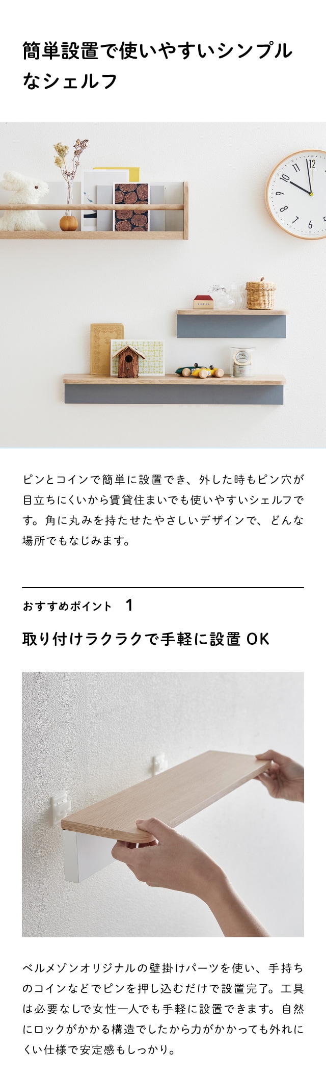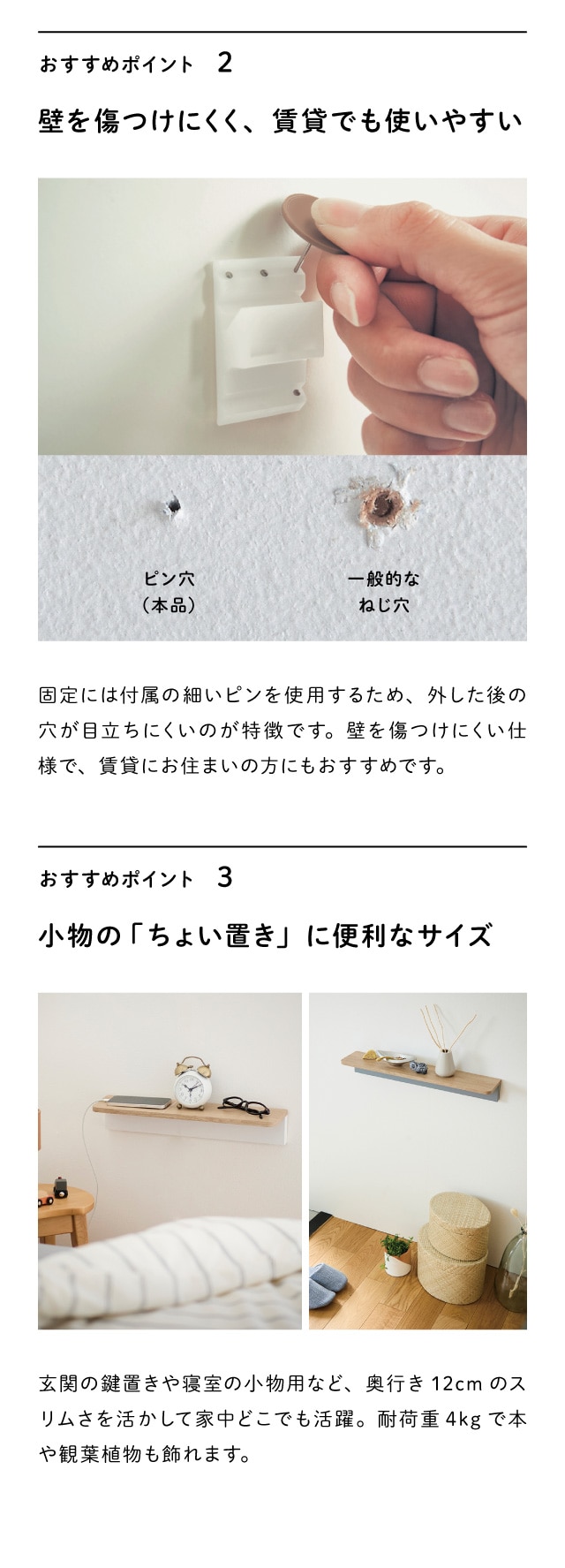 壁にちょっとしたものを飾れる棚が欲しい方へ。オリジナルの金具で女性一人でも簡単に取り付けられ、壁をおしゃれに飾れるシンプルなシェルフです。ピン跡が目立たないため、賃貸住宅やDIYが苦手な方にもおすすめです。