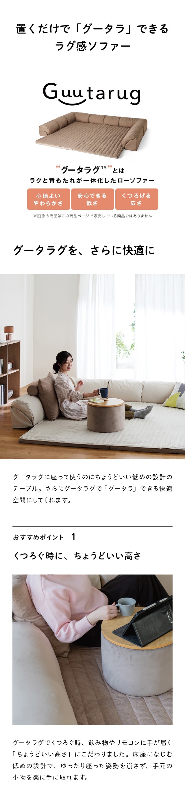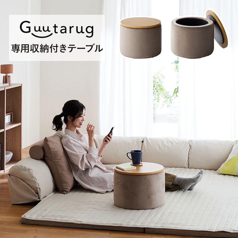 ●グータラグに合わせた低めの設計で、くつろぎ中に飲み物や携帯を置くのに最適です。