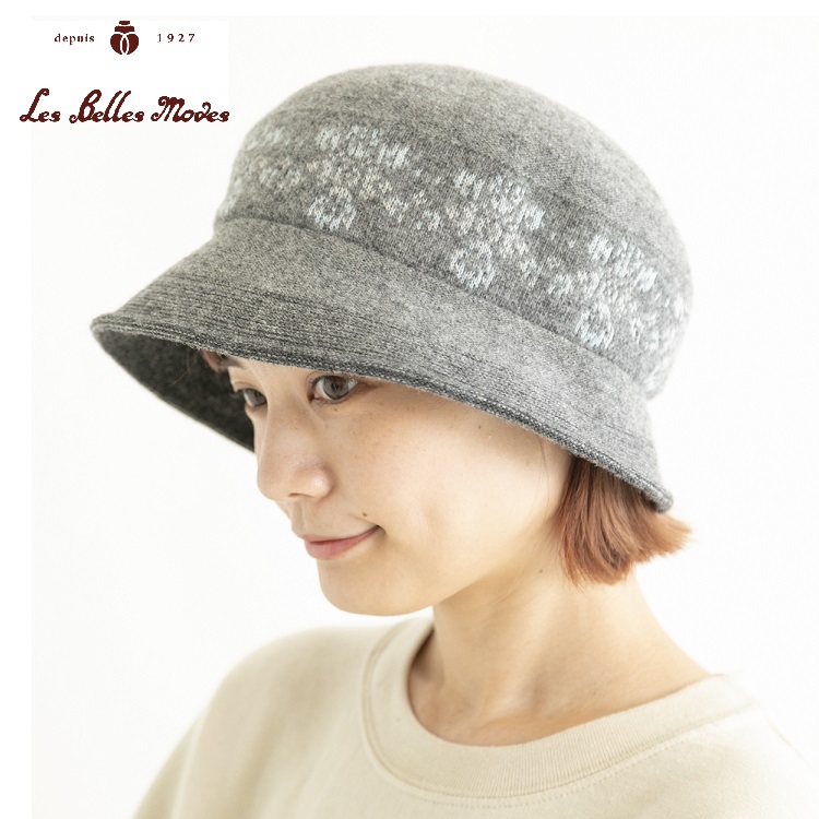 ハット ウール 日本製 レディース 帽子 秋冬(グレー/ベージュ/バーガンディー)07-669 北欧モザイク柄のふんわりクローシュ ベルモード