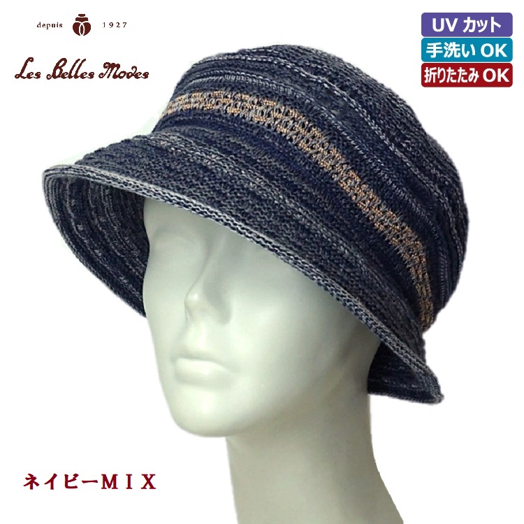 ハット UV帽子 日本製 蒸れにくい 洗える たためる 帽子 レディース 春夏(ネイビーMIX)07-680 色づくコットン混クローシュ ベルモード ポイント利用