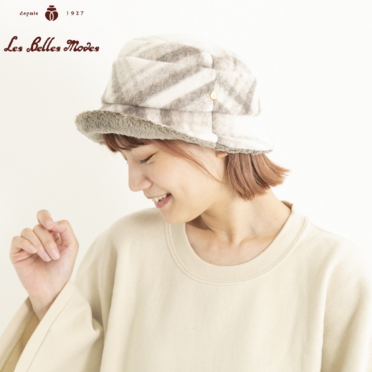 ハット ウール混 日本製 裏起毛 暖か バケハ 帽子 レディース 秋冬 (ベージュ系/ブラック系) 24-543 スライバーチェッククローシュ ベルモード ポイント利用