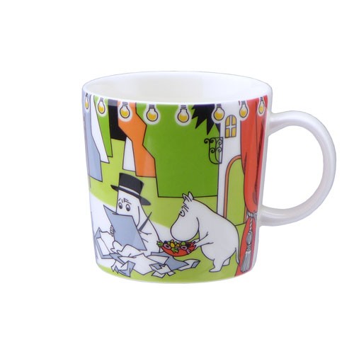 ムーミンシリーズの2017年夏限定アイテム。物語「ムーミン谷の夏まつり」のシーンから、いくつかのイラストが描かれています。大洪水に遭ったムーミン一家は、流されてきた家に避難するも、実はそこは劇場だったのでした・・・。衣装部屋で見つけた、たくさんの素敵なドレスにうっとりするスノークのおじょうさん。行方不明になってしまったムーミンたちと再会するため劇をすることになり、お芝居を書くムーミンパパ、それを気遣うムーミンママ。それぞれの場面が、カラフルなイラストで描かれています。