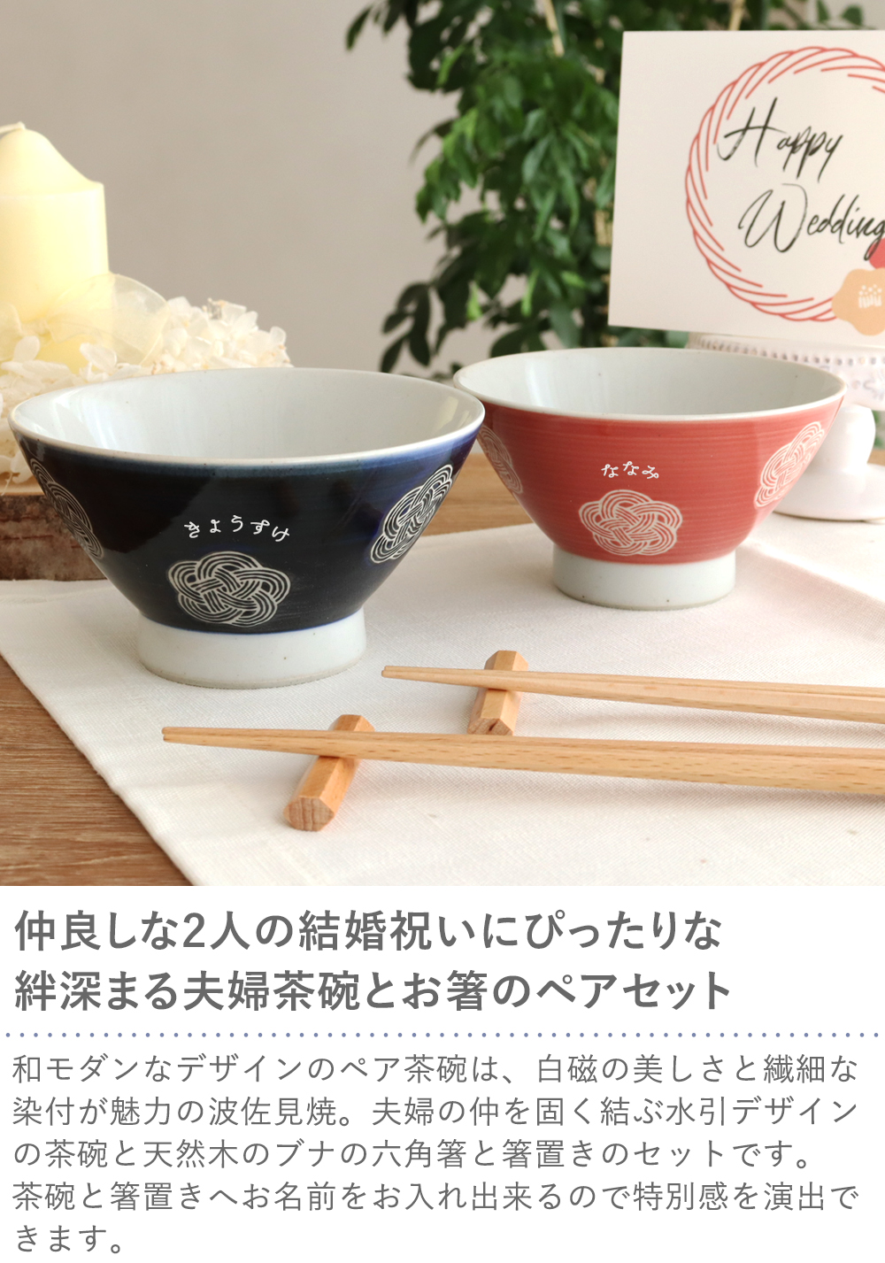 | 名入れについて ・オプションで夫婦茶碗/夫婦箸にお名前をお入れいたします。 ・刻印できる文字数にご注意下さい ・英字・ひらがな10文字程度 ・名入れのアルファベット文字は、頭文字が小文字の際は大文字に変更いたします。 予めご了承下さい。 ・お名前のローマ字が分からない方はこちら →ローマ字について