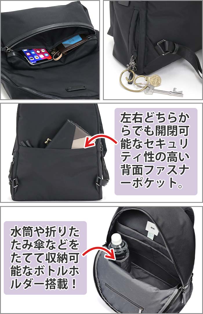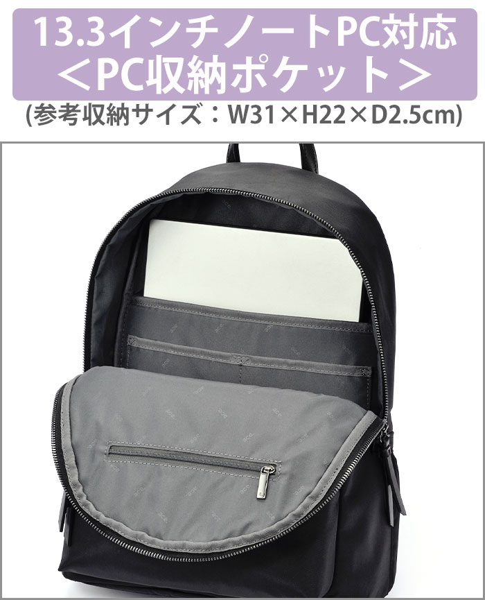 | 働く女性のスニーカー通勤にも合うビジネスリュックシリーズ『サルティー』登場! カジュアルなデイパック型のデザインで、通学通勤の方にもおすすめのオン・オフ兼用リュックです。 メインルームは、A4サイズが収納可能で、13.3インチのノートPCやタブレットの収納が可能なクッションポケットを搭載。 小物を収納できるポケットだけでなく、ボトルや折り畳み傘を収納できるホルダーも付いています。 外側には、フロントポケットをはじめ、鍵など小物の出し入れに便利な「キーフック付きサイドポケット」、左右どちらからも出し入れしやすい「背面セキュリティポケット」が搭載されており、収納力抜群◎ ショルダーベルトの裏側にはクッションパッド入りで、滑りにくいネオプレン調素材を採用。高まる環境意識にも対応する為、本体生地にはGRS(グローバル・リサイクル・スタンダード)認証※の100%リサイクルナイロン生地を使用しています。 必要な身の回りの物はしっかり収納できるので、毎日の通学・通勤といったデイリーユースから、休日のお出掛けや旅行などのレジャーにもピッタリな機能性を兼ね備えたおすすめのバッグです。 ※ リサイクル含有物、加工流通過程管理、社会および環境慣行、および化学規制の第三者認証の要件を設定する、国際的で自発的な完全製品基準です。 |