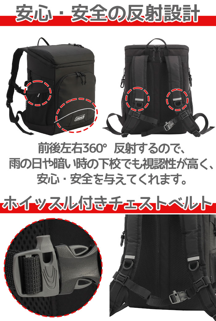 | 大人気ブランド【coleman(コールマン)】の軽くて丈夫、ランドセルとしても使えるキッズ用バックパック登場! 入口が大きく開くので荷物の出し入れがしやすいメイン収納部は、A4サイズのフラットファイルがらくらく収納できる安心のサイズ感。 内装の背面側には、クッション性のあるポケットを搭載。授業で使う電子機器類を衝撃から保護します。 その他内外に様々な用途のポケットを装備しており、整理整頓がしやすいのも嬉しいポイント。 給食袋など引っかけられるフックも両サイドに付いています。ショルダーベルトには、防犯ブザーなどを引っかけられるDカン付き。 背面とショルダーベルトの裏側は、通気性の良いメッシュ素材&クッション仕様。もしもの時に活躍するホイッスルバックルのチェストベルト付きで、ズレ落ちを防止。ベルト位置は上下に調節できます。 前後左右にリフレクター付きで暗い道での安全対策も◎ 時代に合わせた機能と快適さを備えた、デイリーに使えるバックパックは、新入学のプレゼントとしても喜ばれること間違いなし♪ |