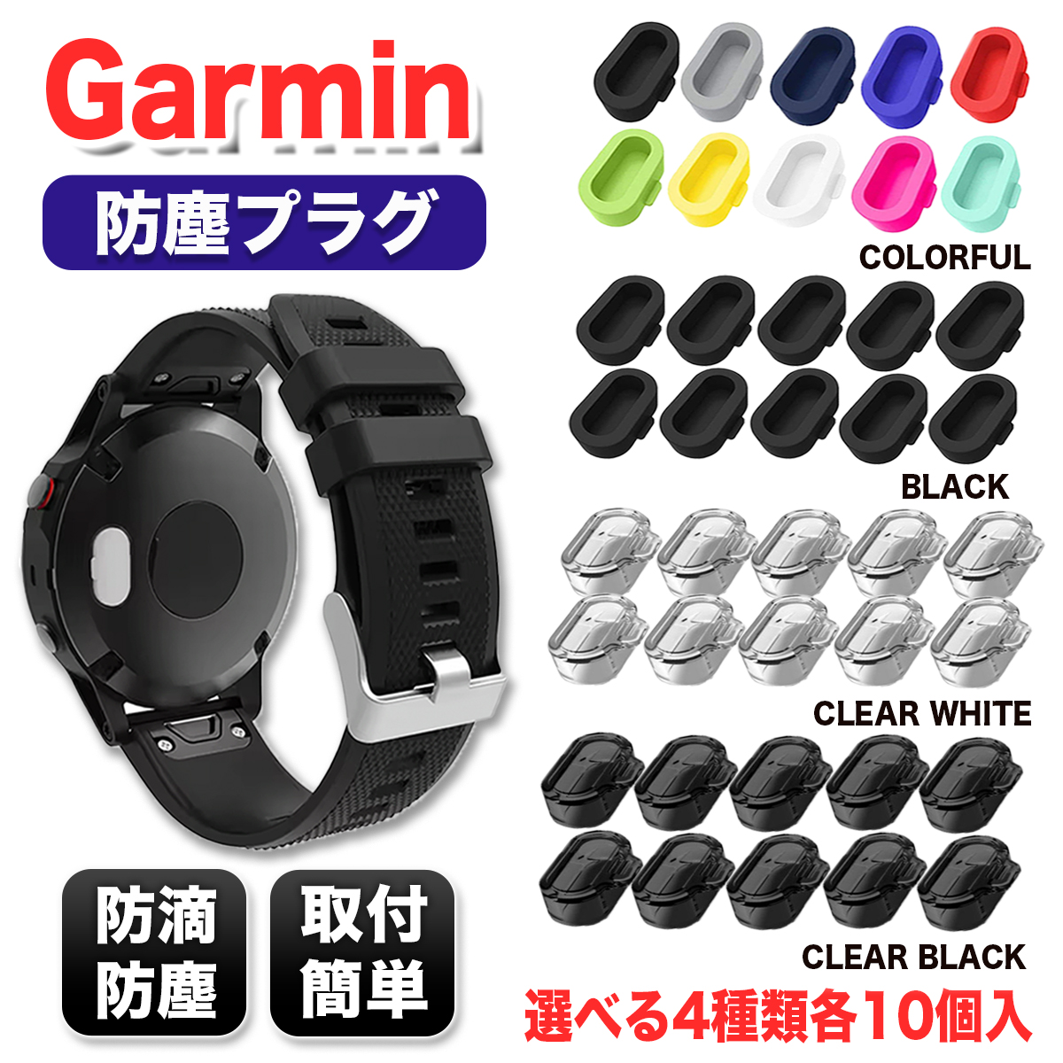 【互換品】 ガーミン GARMIN 防塵プラグ カバー キャップ 防滴 保護 充電 端子 ブラック カラフル クリアブラック クリアホワイト 各10個 Watch ウォッチ