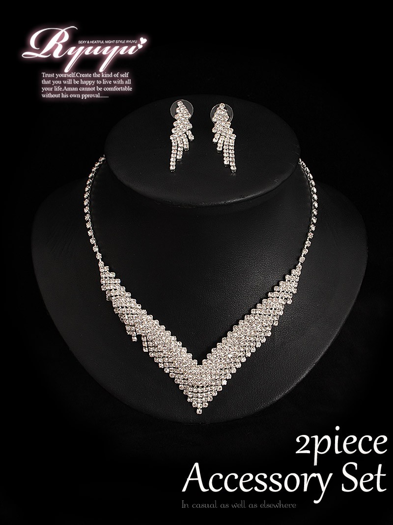 ◆Information◆ ☆Vカットデザインに煌めくラインストーンが敷き詰められたネックレス&ピアスのお得な2点セット♪ ☆ピアスとネックレスを一緒に着けると統一感バッチリで華やかなアクセサリーはキャバ嬢さん必見ッ♪ ☆デコルテラインを綺麗に魅せてくれるアクセはキャバドレスには勿論!パーティドレスにも使えるアクセサリーセット♪ ◆カラー◆ シルバー ◆サイズ◆ フリーサイズ ◆素材◆ - ◆商品仕様◆ ※当製品は素材により、汗、水、雨、湿気、たばこのヤニ等が原因で染色の一部が色落ち、変色する場合があります。 ※肌の敏感な方、金属アレルギーの方はご注意下さい。 ※小さなお子様が誤って飲み込まないよう、手の届かない場所に保管をお願い致します。