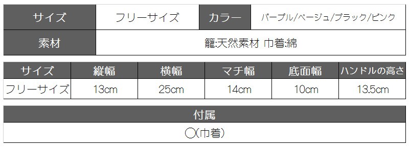 ◆Information◆ ☆浴衣にピッタリのおしゃれな竹籠バッグは涼しげな竹籠に可愛い花柄の巾着を合わせた和装用バッグ♪ ☆巾着は着脱可能なのでお手持ちの巾着を使用することも可能で巾着単品で使用も◎な巾着バッグ♪ ☆使い勝手の良い舟型かごバッグは荷物がたっぷり入る竹編みのかごバッグ♪ ◆カラー◆ パープル/ベージュ/ブラック/ピンク ◆サイズ◆ フリーサイズ ◆素材◆ 籠:天然素材 巾着:綿 ◆商品仕様◆ 付属:◯(巾着) ◆モデル◆ 名前:高崎モモコ 身長:160cm 着用:Mサイズ